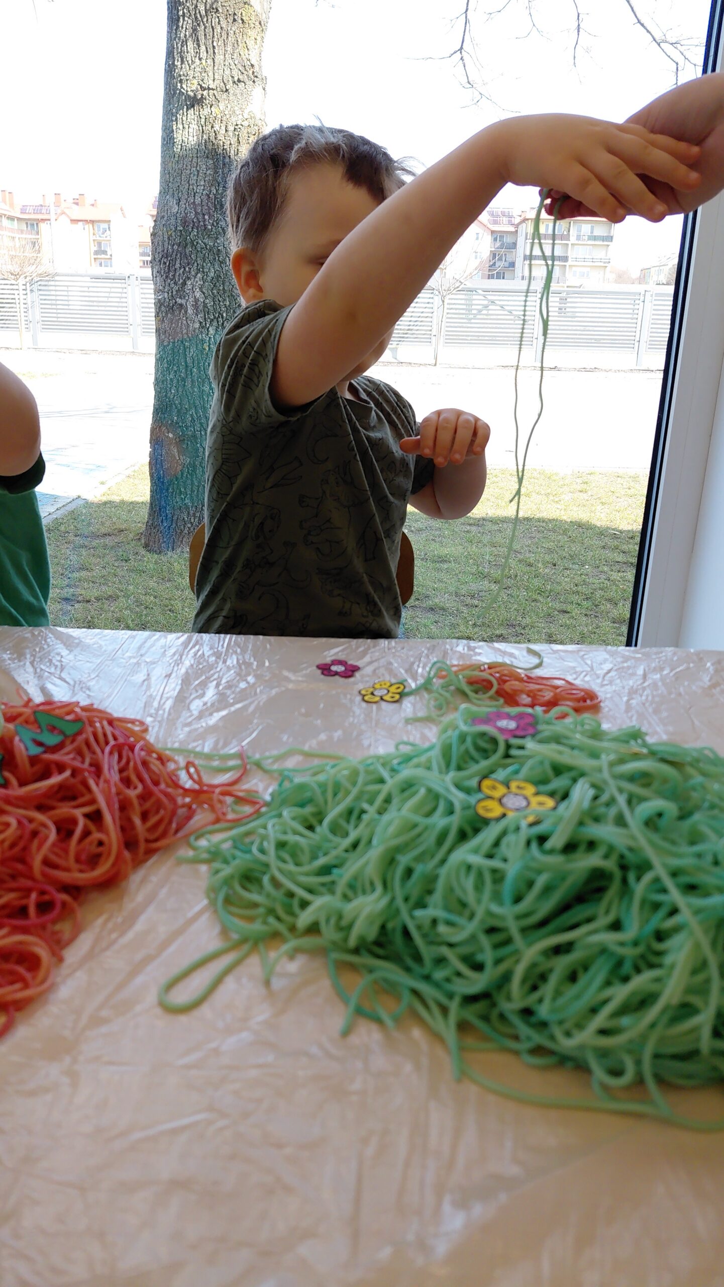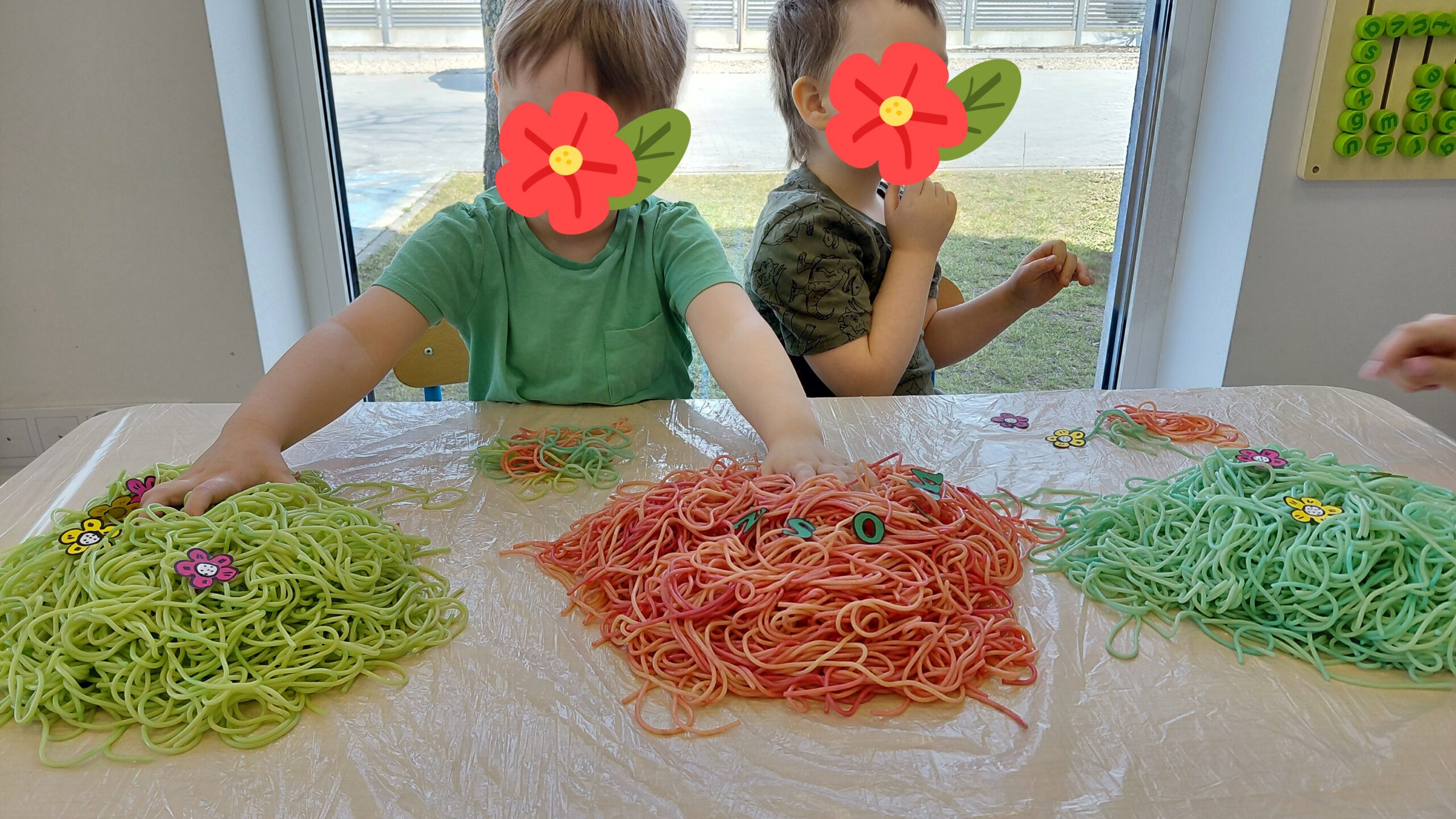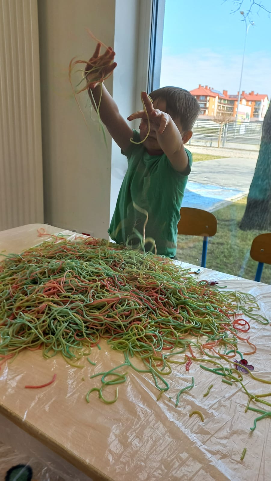 Kolorowy makaron stał się inspiracją do twórczego działania – dzieci doświadczały, tworzyły i eksperymentowały, rozwijając motorykę małą, koordynację oraz integrację sensoryczną.