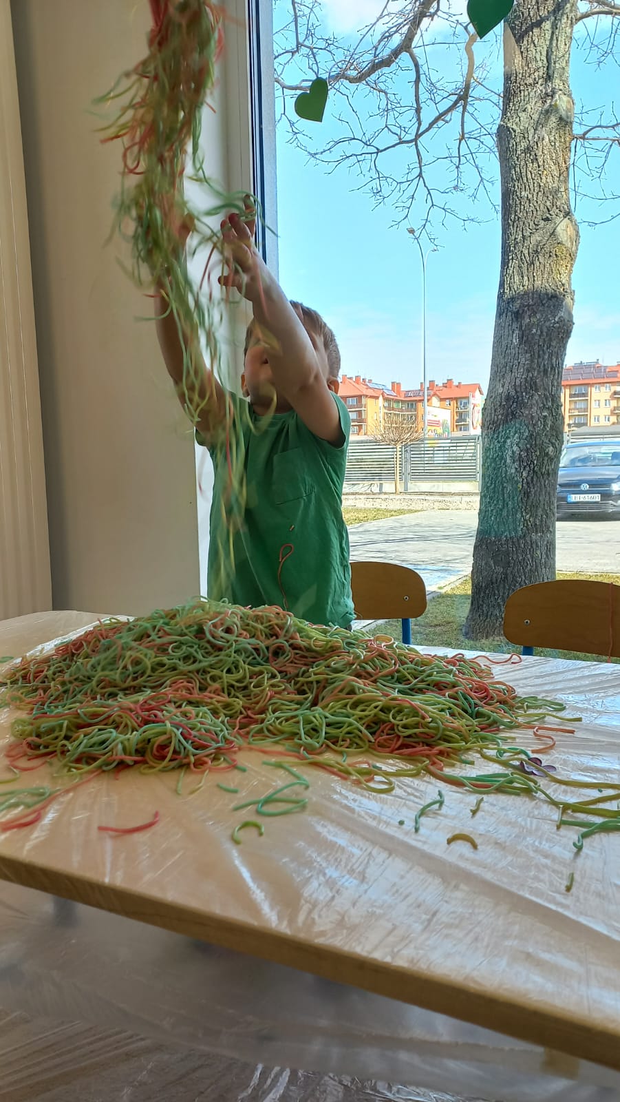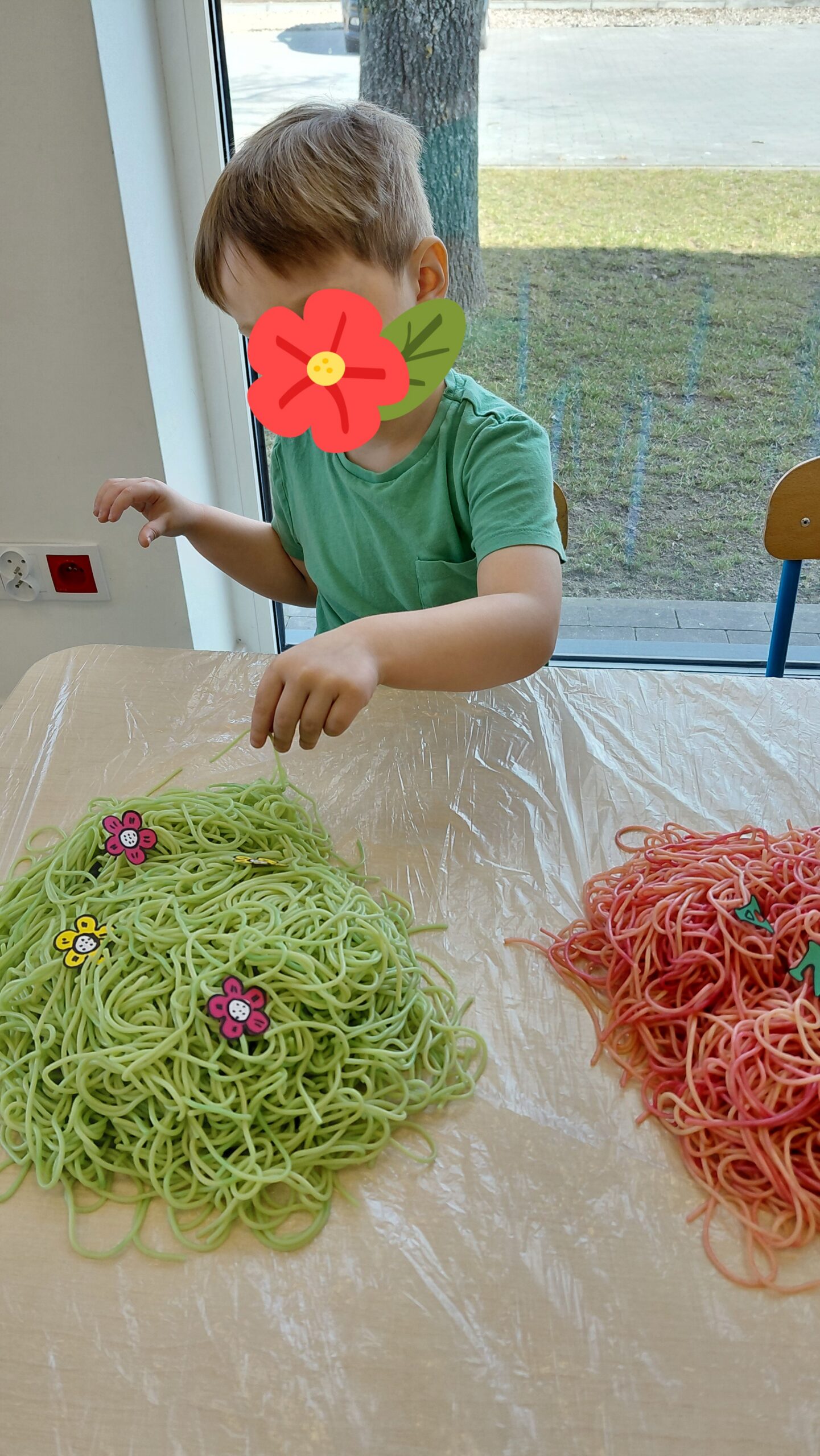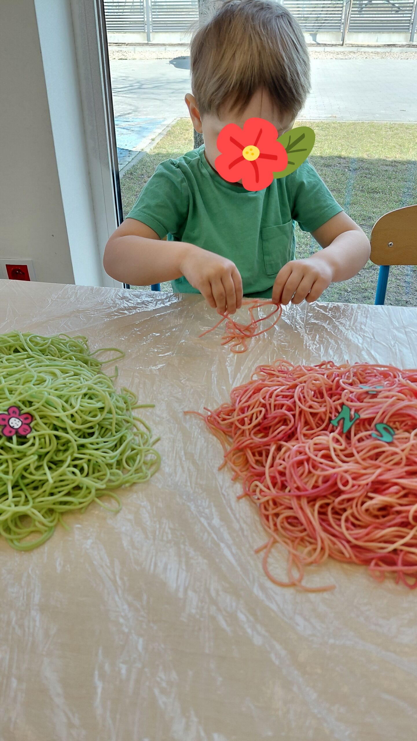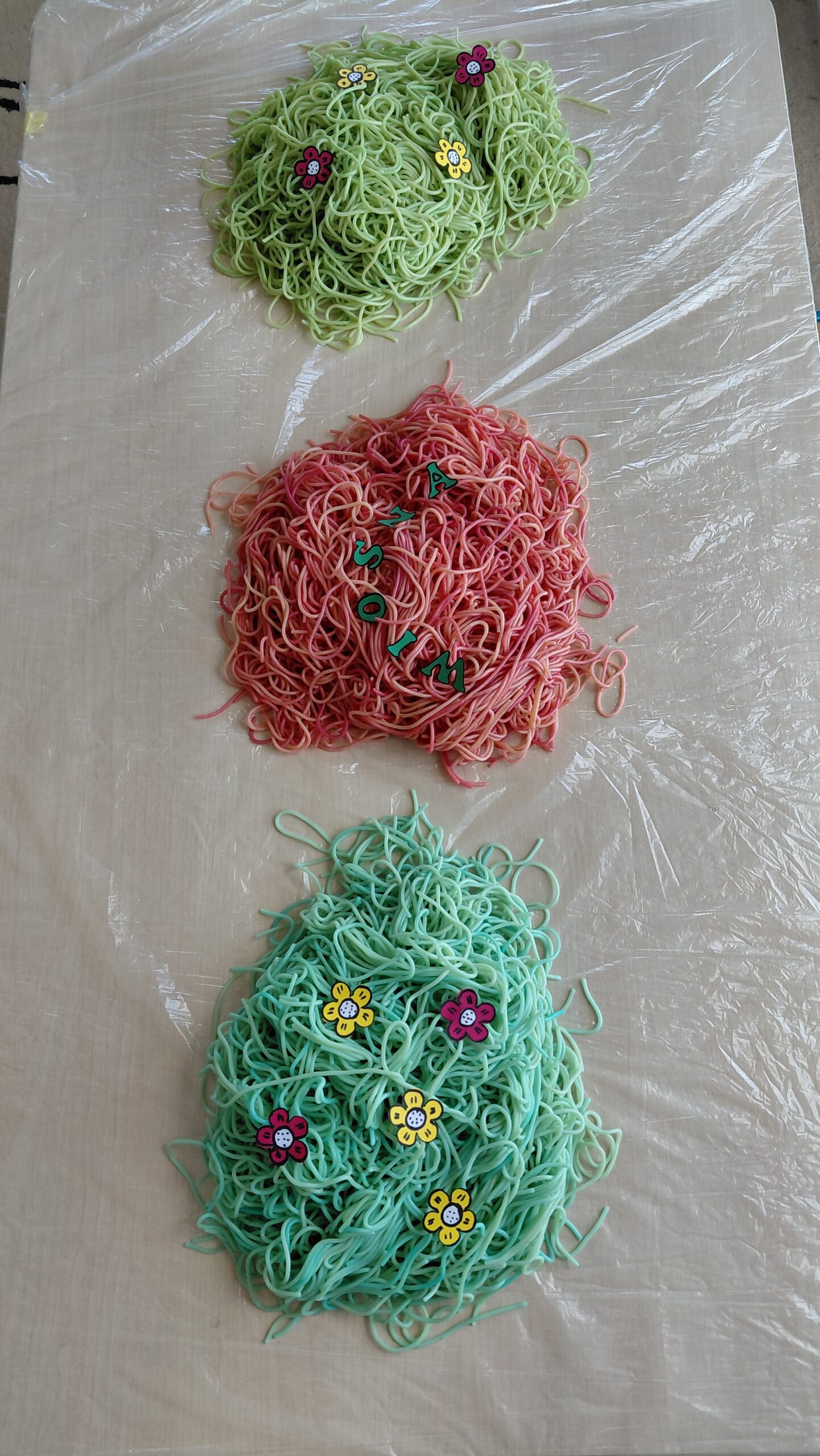 Kolorowy makaron stał się inspiracją do twórczego działania – dzieci doświadczały, tworzyły i eksperymentowały, rozwijając motorykę małą, koordynację oraz integrację sensoryczną.